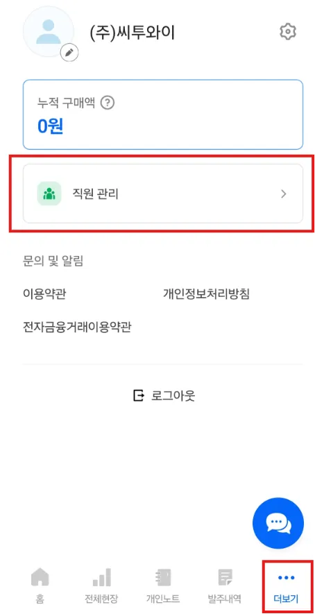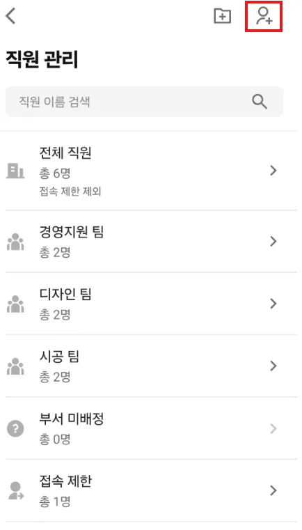 하단 메뉴 바 > 더보기 > 직원 관리 > 상단 + 버튼 클릭