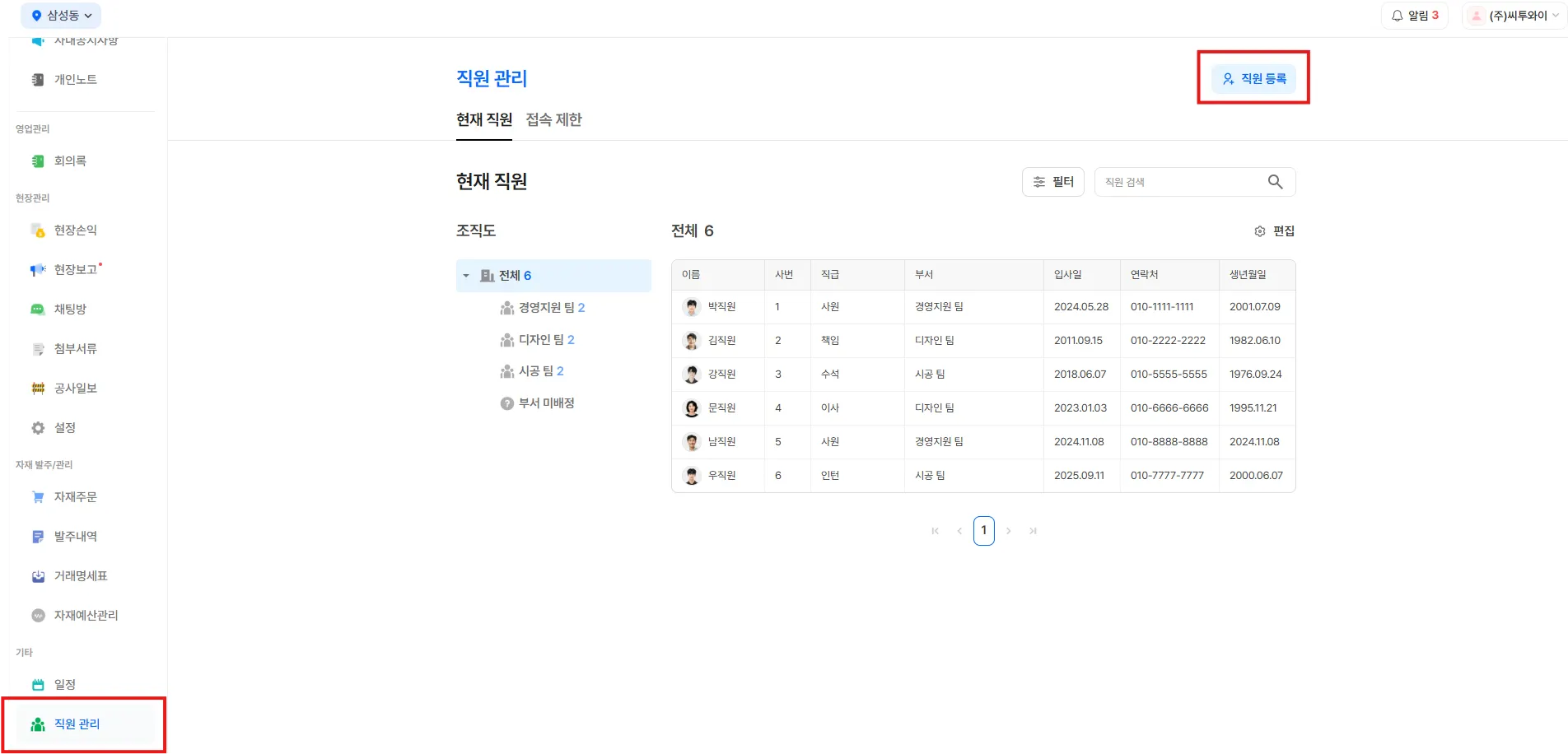 왼쪽 사이드 바 > 직원 관리 > 직원 등록 클릭