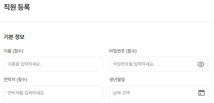 직원 기본 정보 입력 후, 하단 직원 등록 버튼을 클릭하면 직원 계정 생성 완료!